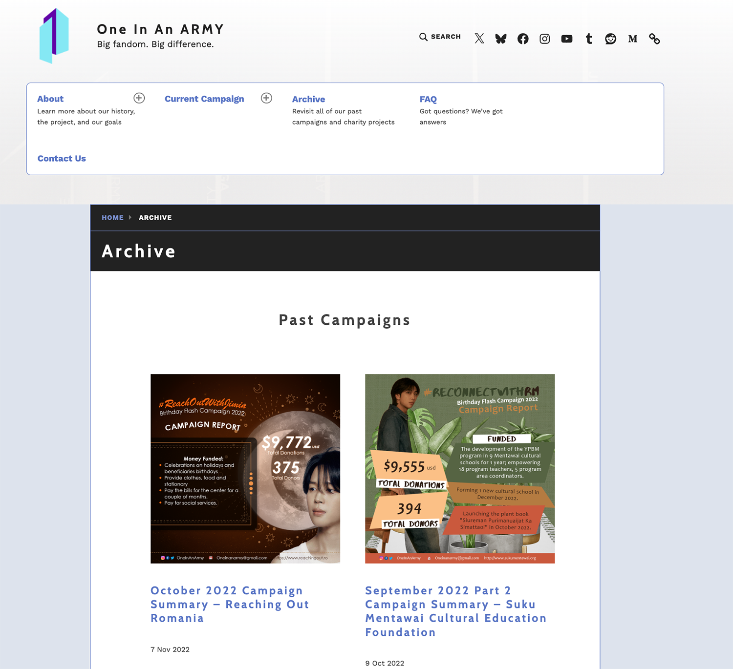 ARMY est un exemple très intéressant et particulier de l’étendue et des possibilités d’action et d’organisation de communautés volontaires en ligne. Nous ferons ici un petit portrait de certains des champs d’action de ARMY. Notons ici que les projets présentés sont tous des initiatives des fans et ne sont pas affiliées à l’entreprise BighHit/HYBE.